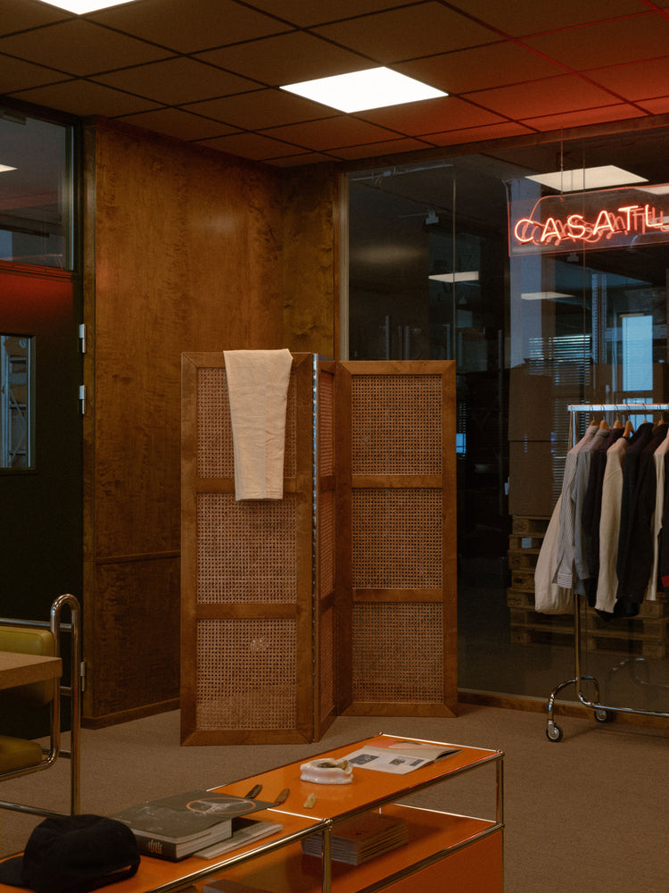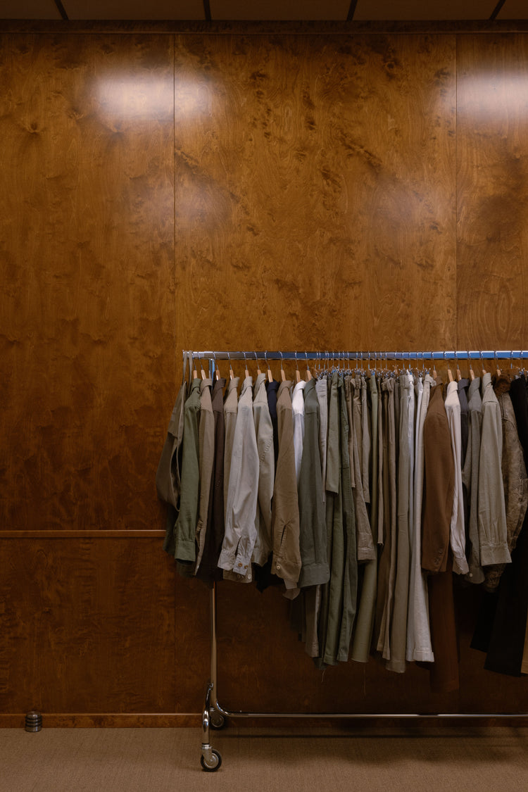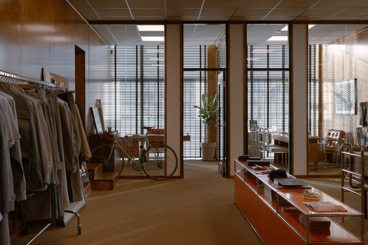 The showroom presents our current collection of trousers, knitwear, shirting, and tailoring in a calm, considered setting, available for private try-ons.