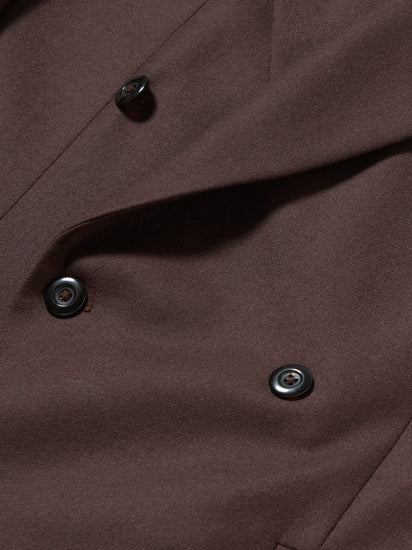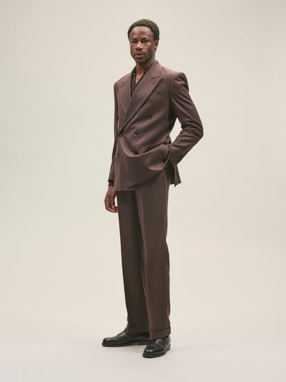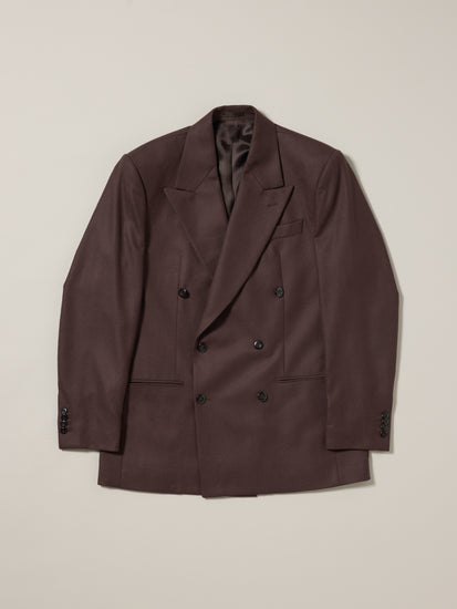 A double-breasted suit jacket cut from brushed wool fabric. Designed with wide, low-positioned lapels and padded shoulders, it offers a strong, structured silhouette. Made to pair with our brushed wool trousers in the same fabric, giving you the option to choose your preferred cut when purchasing as a suit.