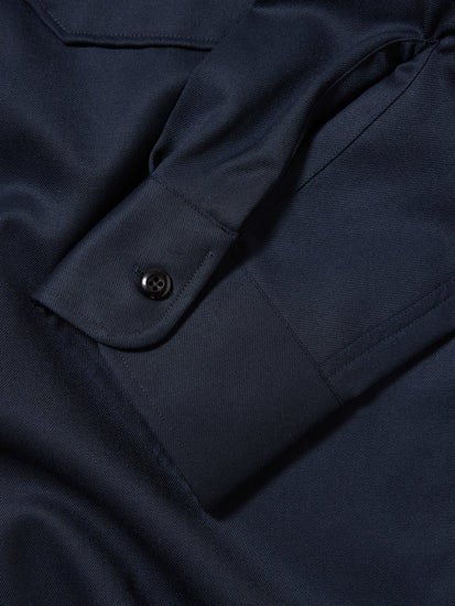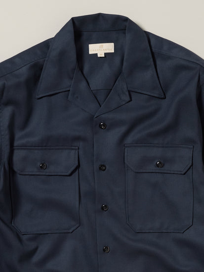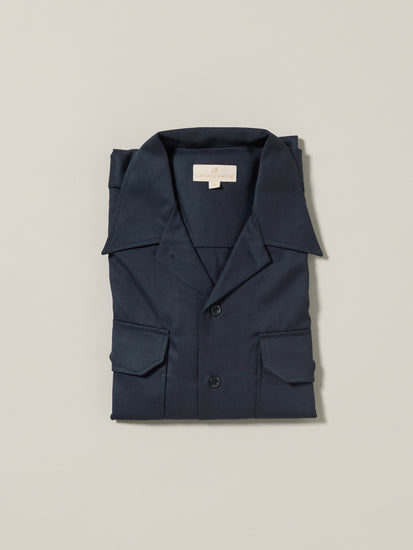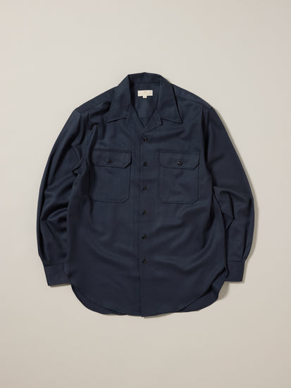 Ben Guerir — Named after the Moroccan city which had a US Air Force Base in the 1950s. The shirt draws inspiration from camp shirts worn by officers and features two chest pockets with flaps. Tailored with a longer and rounded hem, its design suggests being tucked in, yet remains a suggestion. Made with a 260 gsm (7.7 oz) 100% fine wool fabric.
