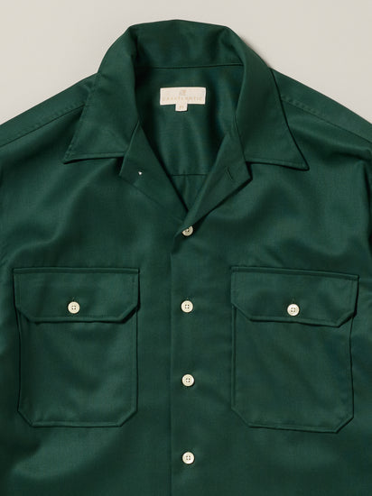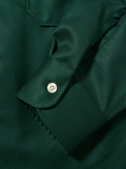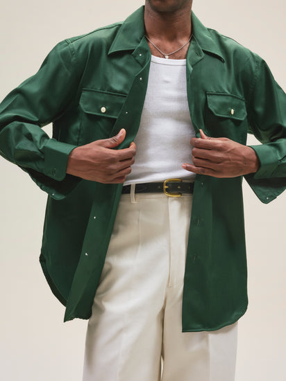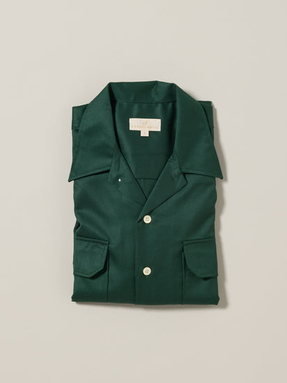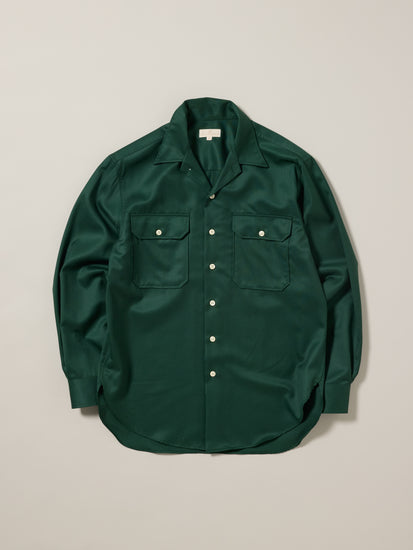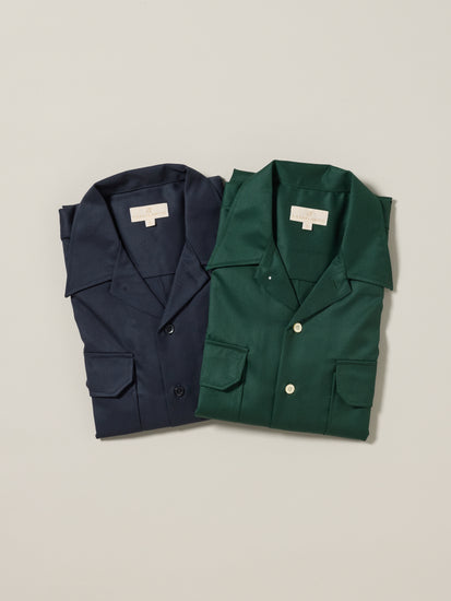 Ben Guerir — Named after the Moroccan city which had a US Air Force Base in the 1950s. The shirt draws inspiration from camp shirts worn by officers and features two chest pockets with flaps. Tailored with a longer and rounded hem, its design suggests being tucked in, yet remains a suggestion. Made with a 260 gsm (7.7 oz) 100% fine wool fabric.