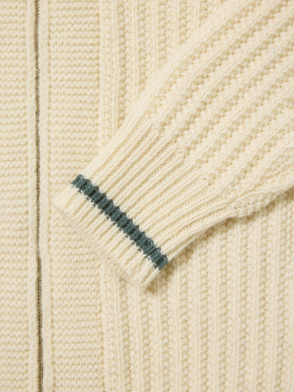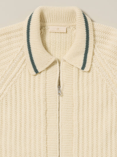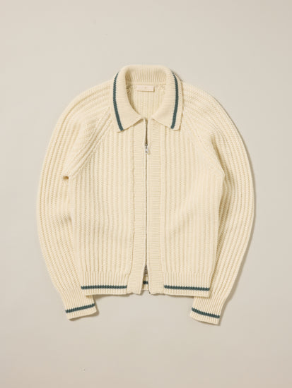 A rugged, low-gauge wool knit featuring a double-puller zip front. It has a slightly oversized fit while maintaining a shorter length, making it an ideal complement to our high-waisted trousers.