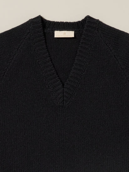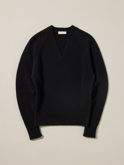 The Meknès Wool Sweater. Made of 100% wool and features a deep and narrow v-neck and is designed to fit generously around the body and sleeves yet with fitted cuffs and hem. The shorter body is proportionally designed to fit our high-waisted trousers. With Italian know-how and in homage to our North African heritage, our knitwear is made in Korba, Tunisia, using British yarn.
