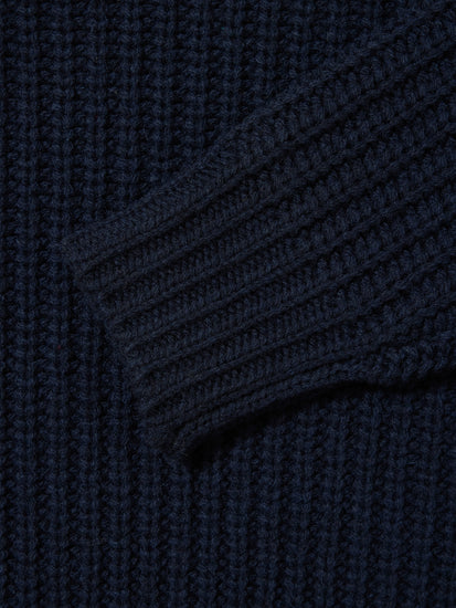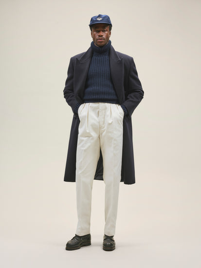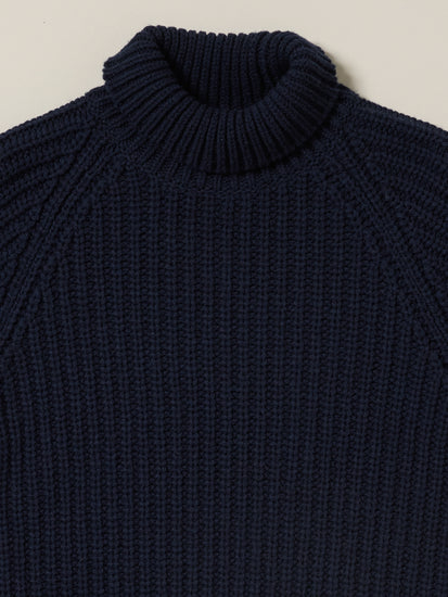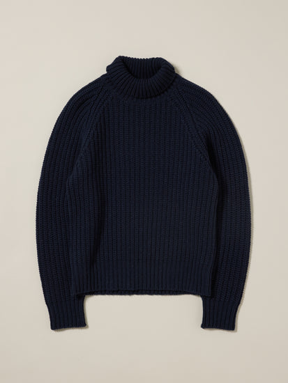 A chunky, low-gauge roll neck sweater inspired by the fishing port of Nador, Morocco. Made from 100% pure new English wool, it features a raglan shoulder construction. The sweater has a relaxed fit through the body and sleeves, with a slightly shorter length that pairs perfectly with our high-waisted trousers.