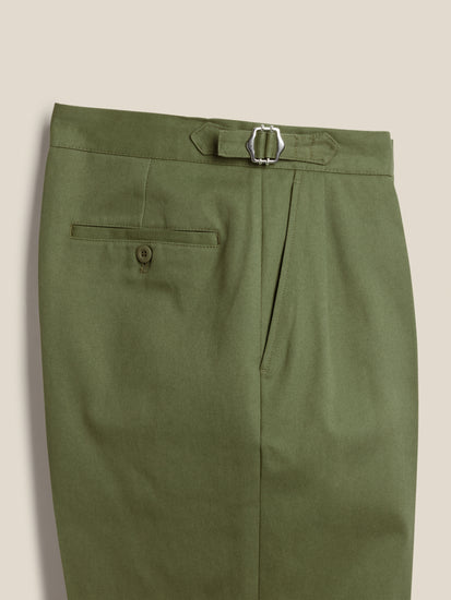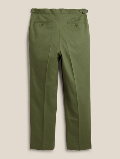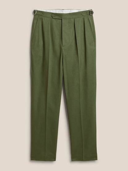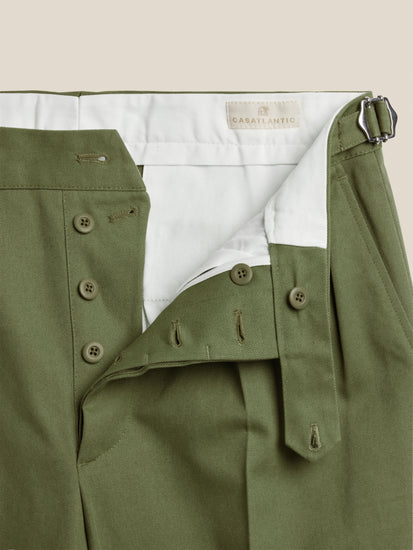 Safi is a nod to 1960s Riviera style, featuring details such as an extended waistband and side adjusters. Designed for a comfortable high-waisted fit, it features a double-pleated front and a button fly. The trousers are crafted from a 300 gsm (8.9oz) cotton twill, exclusively woven for Casatlantic to meet our specific requirements in durability and aging.