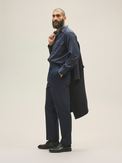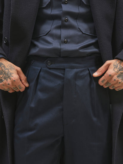 Safi is a nod to 1960s Riviera style, featuring details such as an extended waistband and side adjusters. Designed for a comfortable high-waisted fit, it features a double-pleated front and a button fly. The trousers are crafted from a 300 gsm (8.9oz) cotton twill, exclusively woven for Casatlantic to meet our specific requirements in durability and aging.