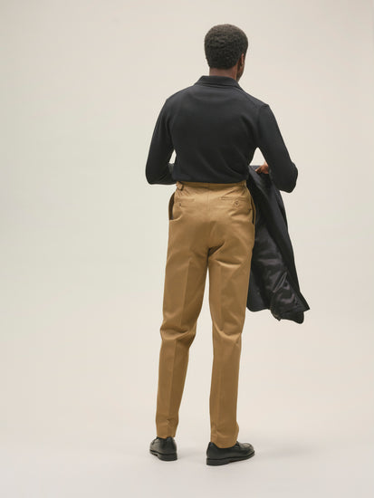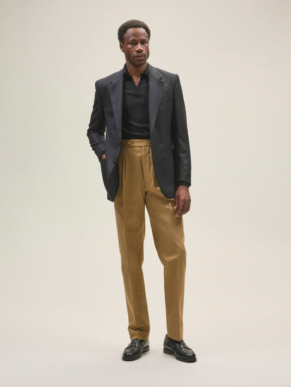 Safi is a nod to 1960s Riviera style, featuring details such as an extended waistband and side adjusters. Designed for a comfortable high-waisted fit, it features a double-pleated front and a button fly. The trousers are crafted from a 300 gsm (8.9oz) cotton twill, exclusively woven for Casatlantic to meet our specific requirements in durability and aging.