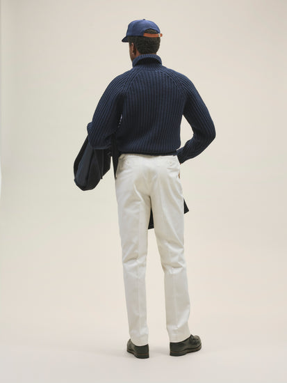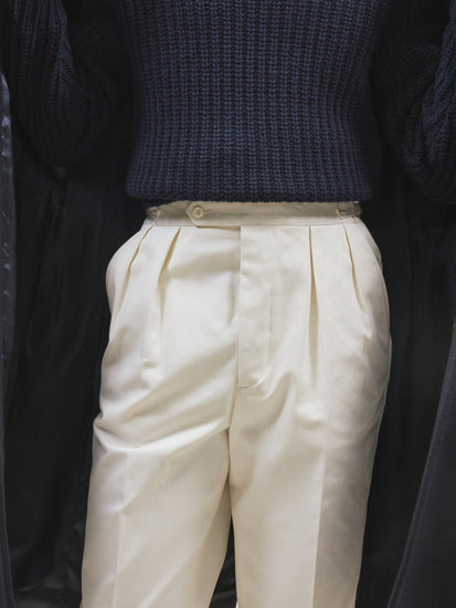 Safi is a nod to 1960s Riviera style, featuring details such as an extended waistband and side adjusters. Designed for a comfortable high-waisted fit, it features a double-pleated front and a button fly. The trousers are crafted from a 300 gsm (8.9oz) cotton twill, exclusively woven for Casatlantic to meet our specific requirements in durability and aging.