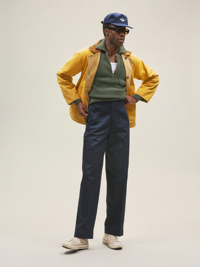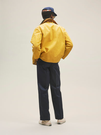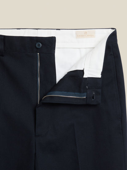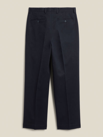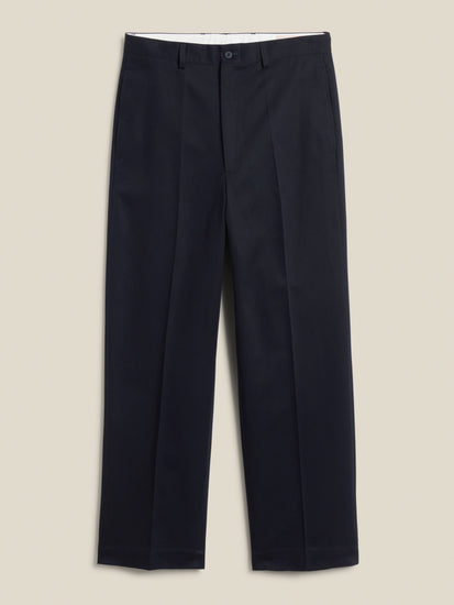 TAZA, a flat-front, wide-leg trouser with two welt back pockets and a zip fly. It sits high at the waist and offers generous room around the thighs and legs. The trousers are crafted from a 300 gsm (8.9 oz) cotton twill, exclusively woven for Casatlantic to meet our specific requirements for durability and aging.
