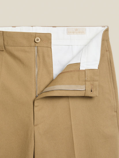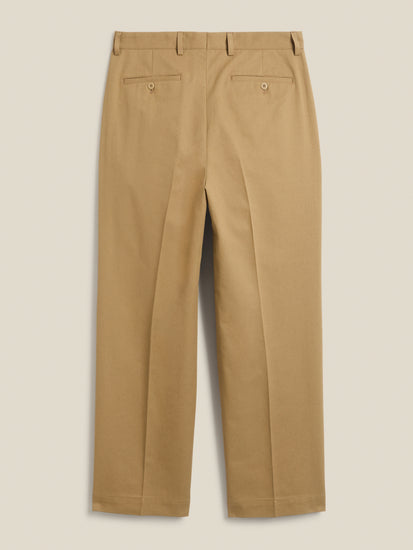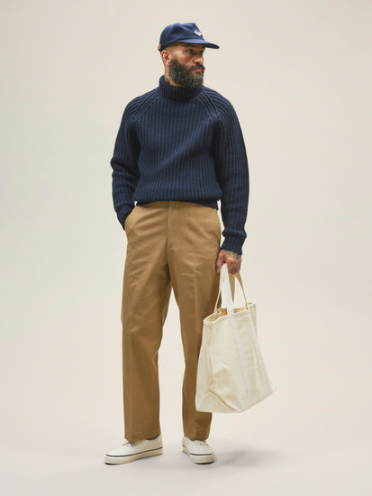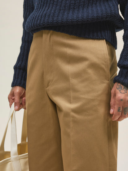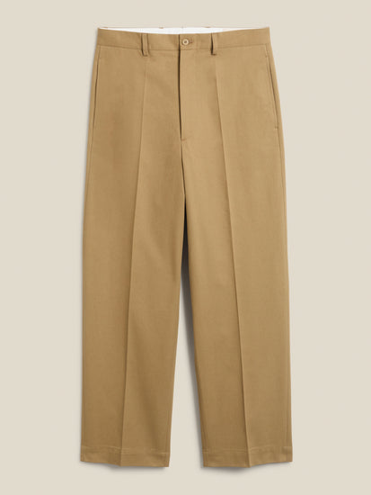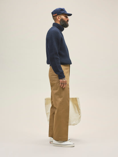 TAZA, a flat-front, wide-leg trouser with two welt back pockets and a zip fly. It sits high at the waist and offers generous room around the thighs and legs. The trousers are crafted from a 300 gsm (8.9 oz) cotton twill, exclusively woven for Casatlantic to meet our specific requirements for durability and aging.