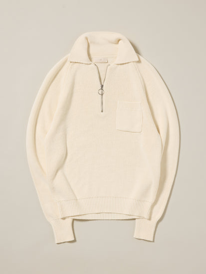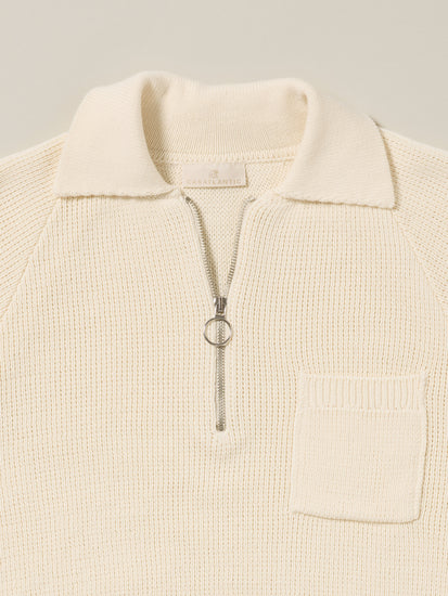 A quarter-zip cotton sweater, knitted in full Milano stitch for a dense, double-faced feel. Inspired by mid-century sports sweatshirts, the Zagora knit combines athletic roots with refined everyday wear. With Italian know-how and in homage to our North African heritage, our knitwear is made in Tunisia using Italian yarn.